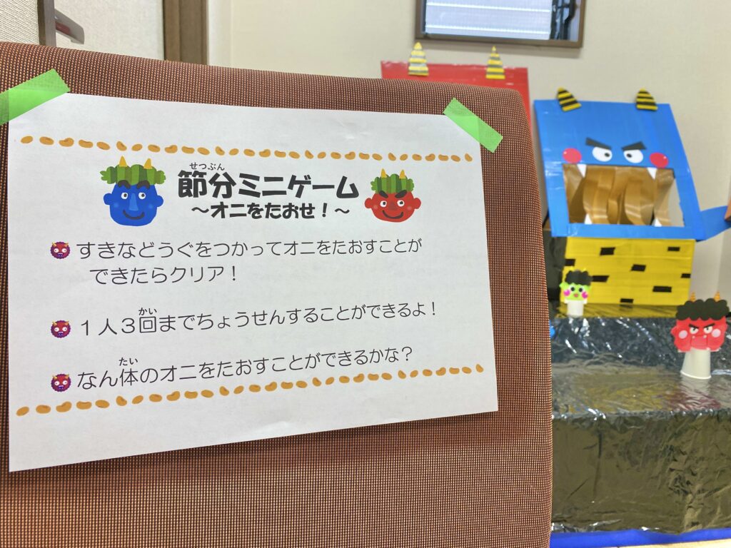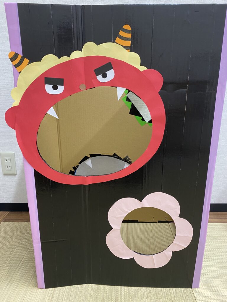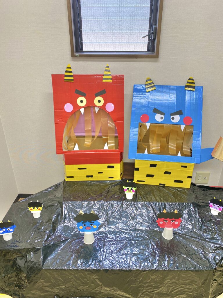 さて、2月は節分やバレンタインなどの季節のイベントがありました!Orange青山では、毎年恒例の節分イベントが実施されましたよ。今年も感染症対策のため、密集・密接を防ぐ方法として「豆まきゲーム」の方式で行っています。豆まきの豆は個包装の物を使用して、段ボールの鬼BOXや鬼の的に豆を当てたり入れたりする節分ゲームをみんなで楽しみました♪子どもたちの「鬼は外~!福は内~!」の掛け声とともに今年も邪気を払うことができました!