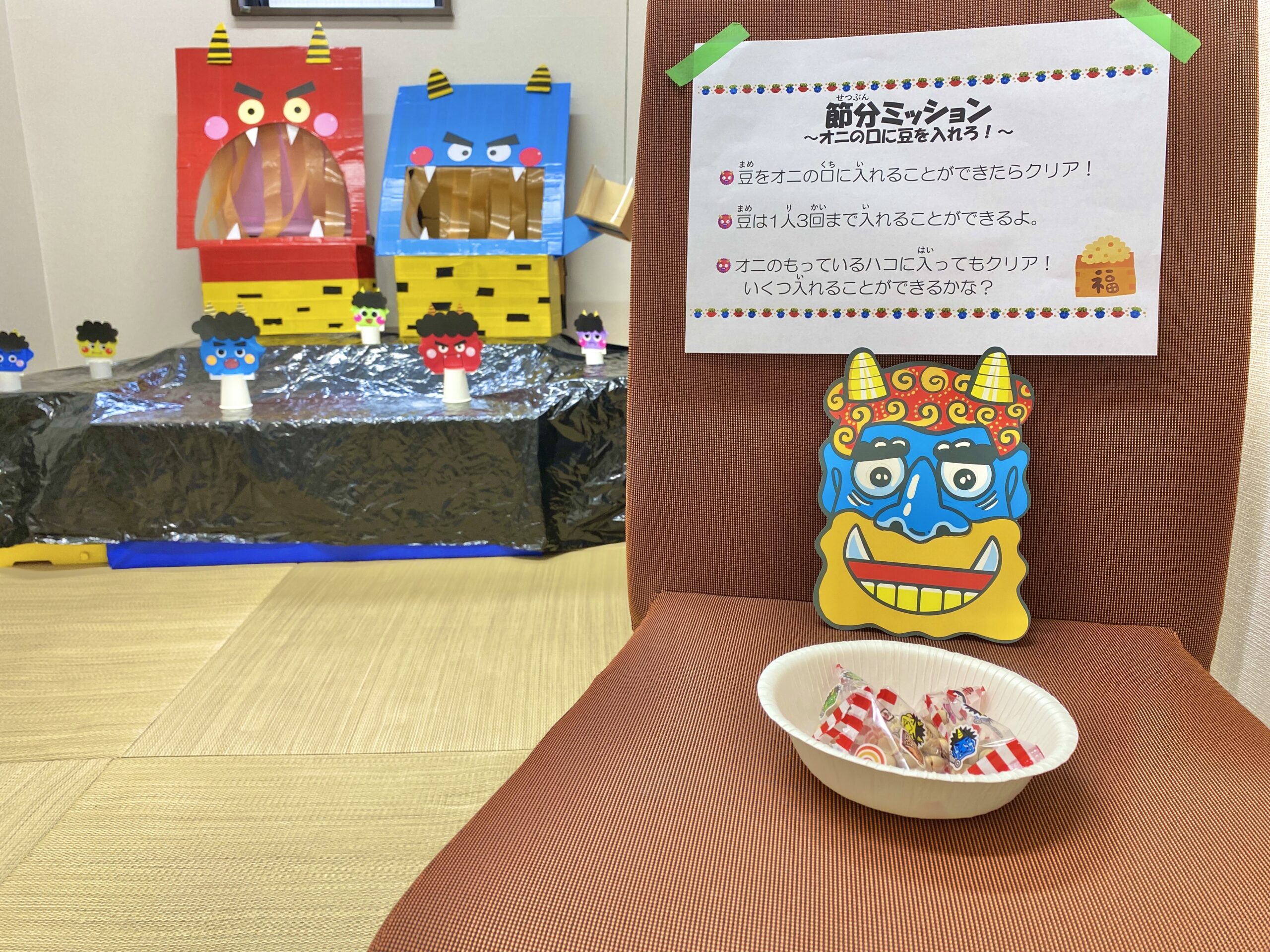 さて、2月は節分やバレンタインなどの季節のイベントがありました!Orange青山では、毎年恒例の節分イベントが実施されましたよ。今年も感染症対策のため、密集・密接を防ぐ方法として「豆まきゲーム」の方式で行っています。豆まきの豆は個包装の物を使用して、段ボールの鬼BOXや鬼の的に豆を当てたり入れたりする節分ゲームをみんなで楽しみました♪子どもたちの「鬼は外~!福は内~!」の掛け声とともに今年も邪気を払うことができました!